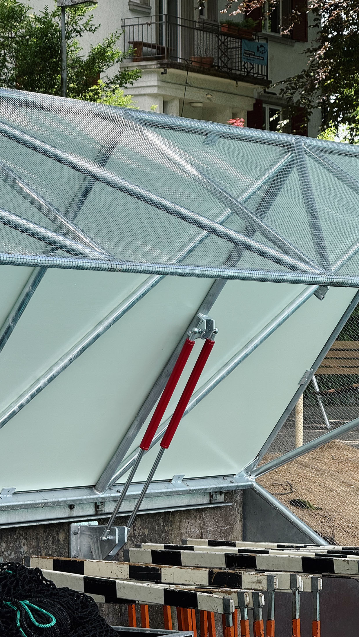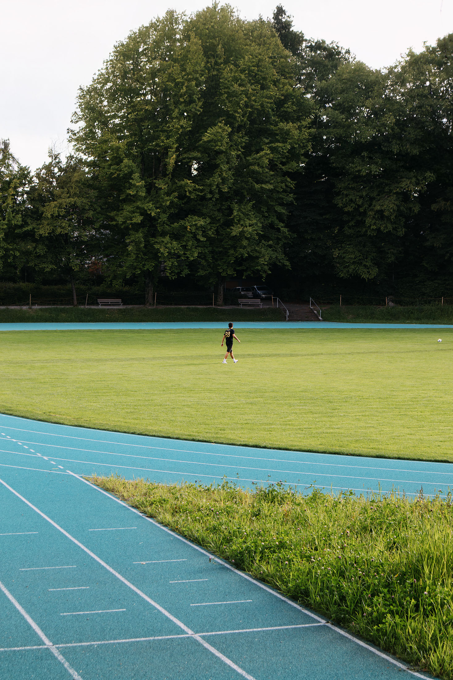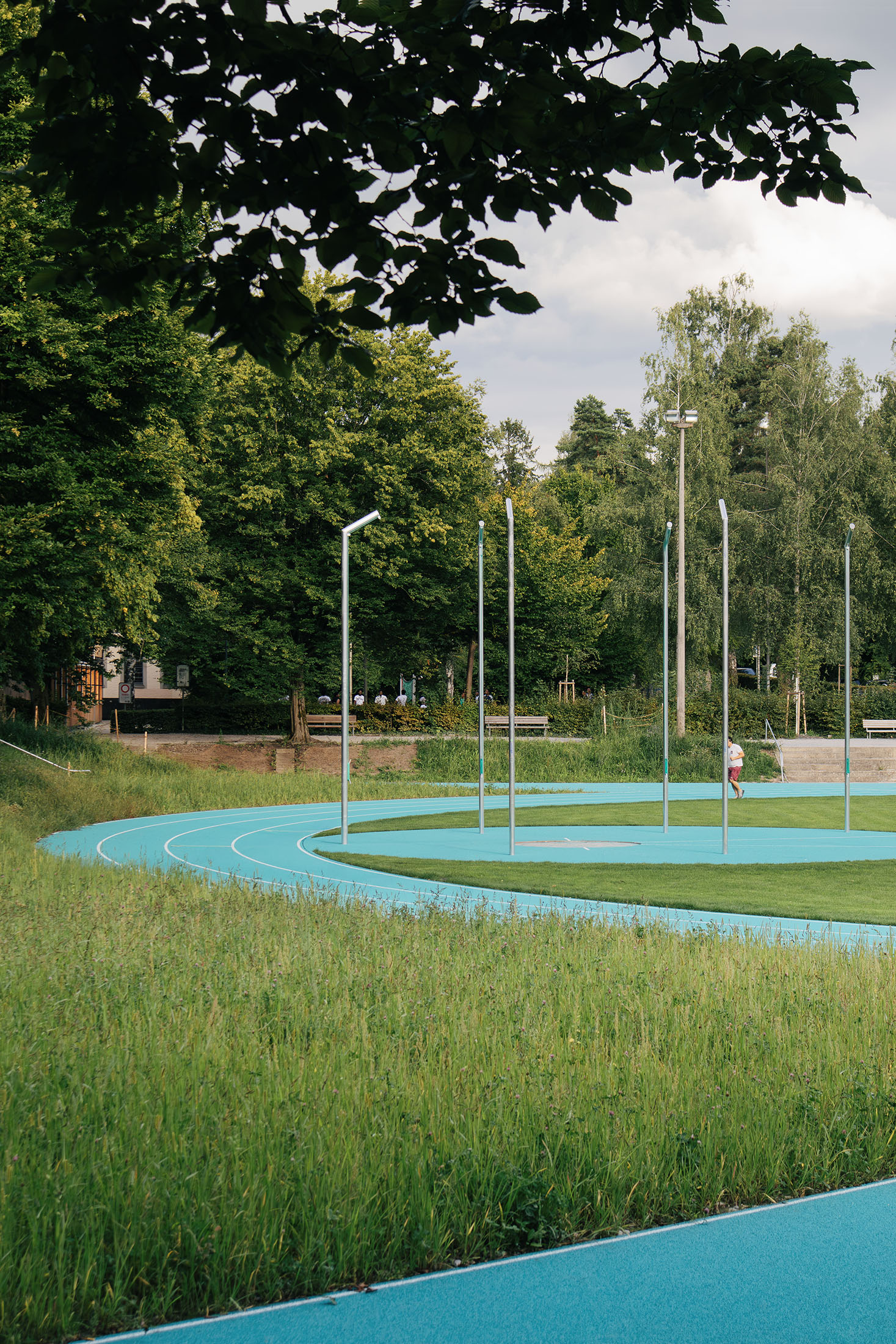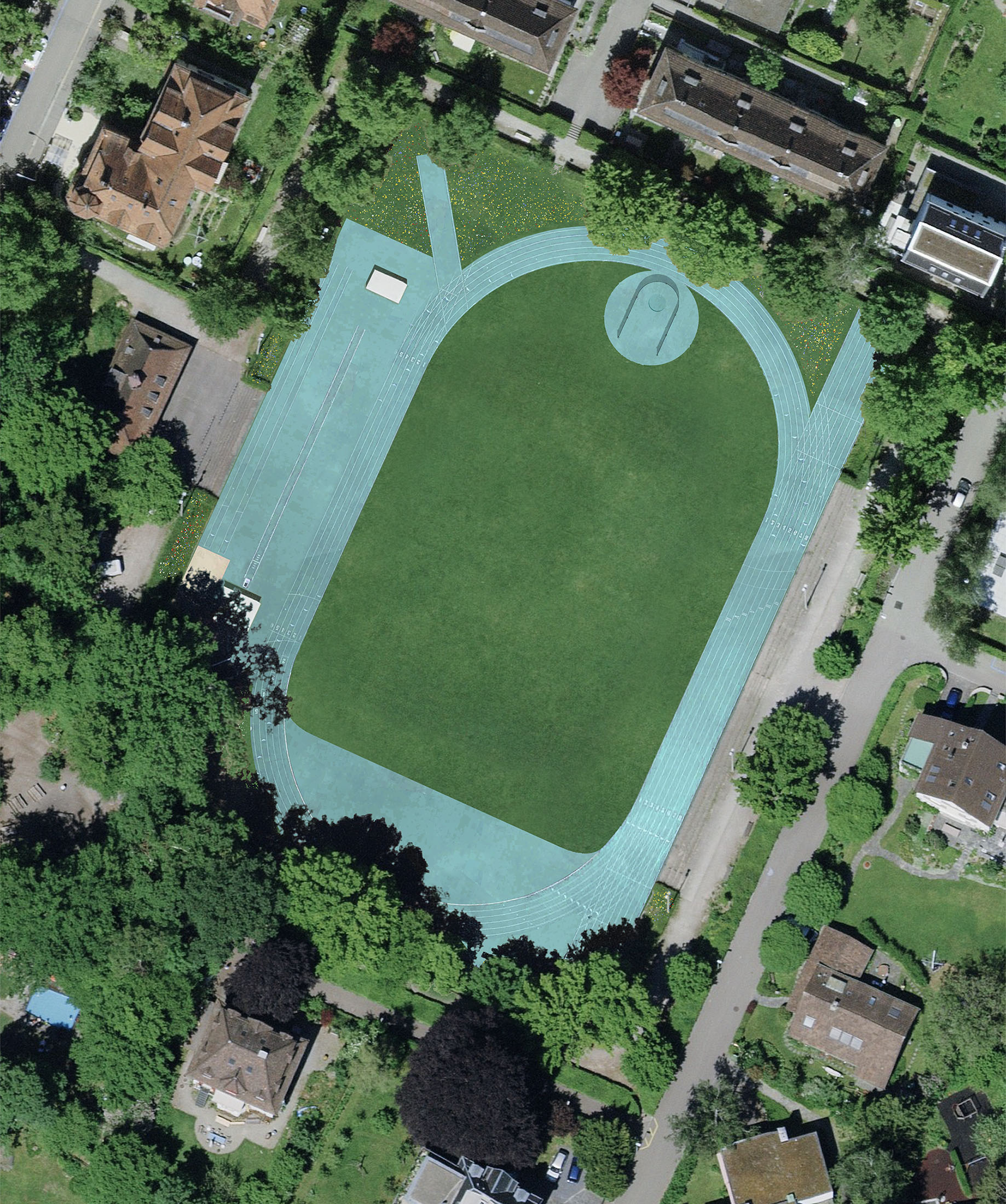 The athletic functions were improved, the grass playing field was extended and the edges of the site gave way to vegetation. The existing hedges around the site were replaced by wild flower fields which have a higher value for biodiversity. By removing the concrete retaining walls, a soft slope appears, revealing the original topography. The ring of trees around the site are completed, providing shade for the spectators. A few added elements: the heavy concrete garage is replaced by a light material storage, simple handrails follow the movement of people. The building received simple maintenance: bringing back its four eyes, mirroring the activities happening on the site, and colours linking it to its beautiful neighbour, Schulhaus Liguster.